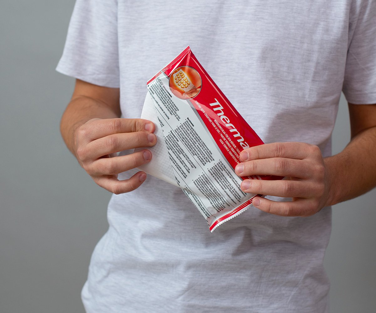 Open the packaging and remove the ThermaCare® HeatWrap directly before use.